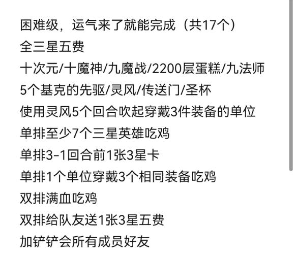 保留容错:排位模式130点血量夺冠(紫色成就)。 满血第一:排位模式100点血量夺冠(紫色成就)。 快乐传递:双人模式给队友传3星橙卡(紫色成就)。 三人成团:单人排位模式上阵7名3星英雄夺冠(紫色成就)。 人脉之选:匹配/排位模式单卡触发4个羁绊(蓝色成就)。