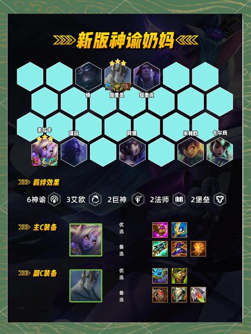 装备选取主C:战争女神 - 希维尔,装备推荐变异转金铲铲+负极斗篷,配合超级肾上腺,强化平A输出。疾射火炮:反曲之弓+反曲之弓,提供输出环境和攻速增益。无尽之刃:暴风大剑+拳击手套,可以替换为饮血和巨杀。副C:虚空先知 - 玛尔扎哈,鬼书、蓝buff和吸血枪是必备,法强和回蓝装备优先考虑。