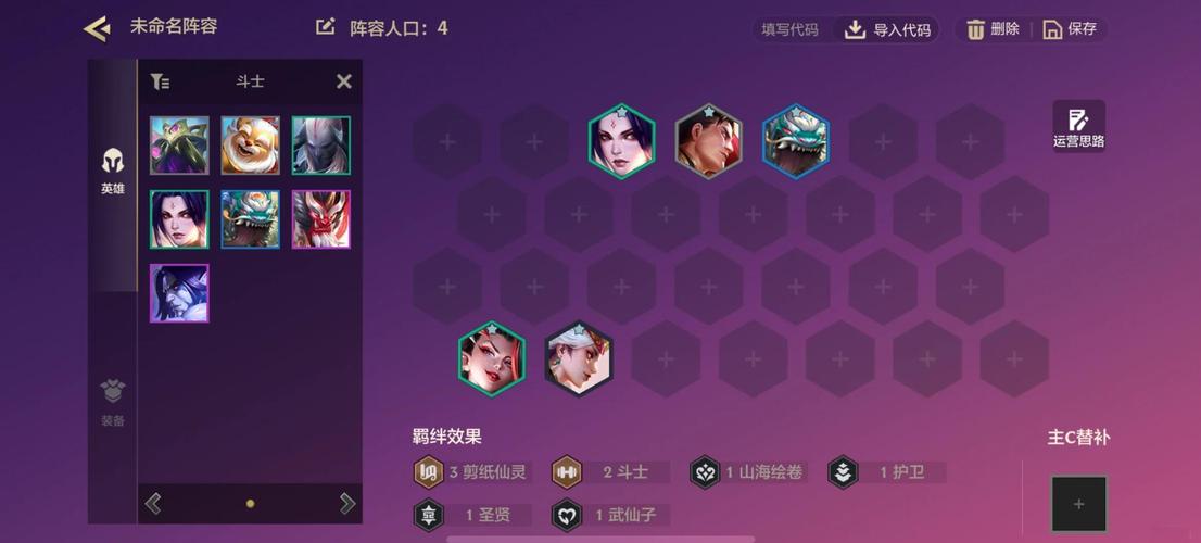 擎天卫(根据具体游戏进程和可选英雄进行搭配)。2武仙子:锐雯、索拉卡、洛(其中索拉卡同时是天将羁绊)。2永森(根据具体游戏进程和可选英雄进行搭配)。核心英雄:主C慧:装备推荐青龙刀、法爆、鬼书(备选帽子、大天使)。副C乌迪尔:装备推荐饮血、泰坦、正义(备选装备通用,猴哥、腕豪等英雄也可使用)。