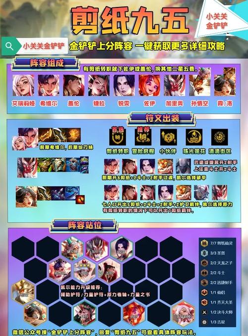 金铲铲之战剪纸仙灵阵容及剪纸画师九五阵容装备搭配推荐:阵容组成:核心英雄:彗、加里奥、孙悟空、艾瑞莉娅、李青、洛、黛安娜、迦娜、锐雯。羁绊搭配:4天龙之子、3剪纸仙灵、2圣贤、2武仙子、2决斗大师、2斗士。装备搭配:法系主C慧:推荐装备为青龙刀、鬼书、帽子或法爆。