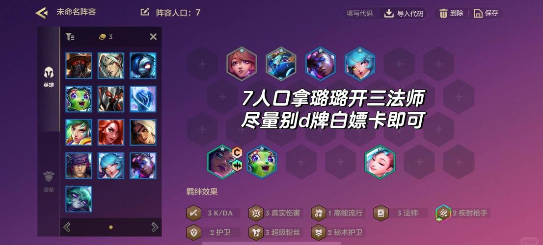 〖Two〗、首先,阵容组成方面,你需要凑齐7个蓝发小队的英雄,通常包括佐伊、俄洛伊、金克丝等,以形成强大的羁绊效果。同时,可以搭配2伏击、2哨兵等羁绊以增强阵容的战斗力。其次,装备选取上,你需要根据每个英雄的特点和定位来为他们选取合适的装备。