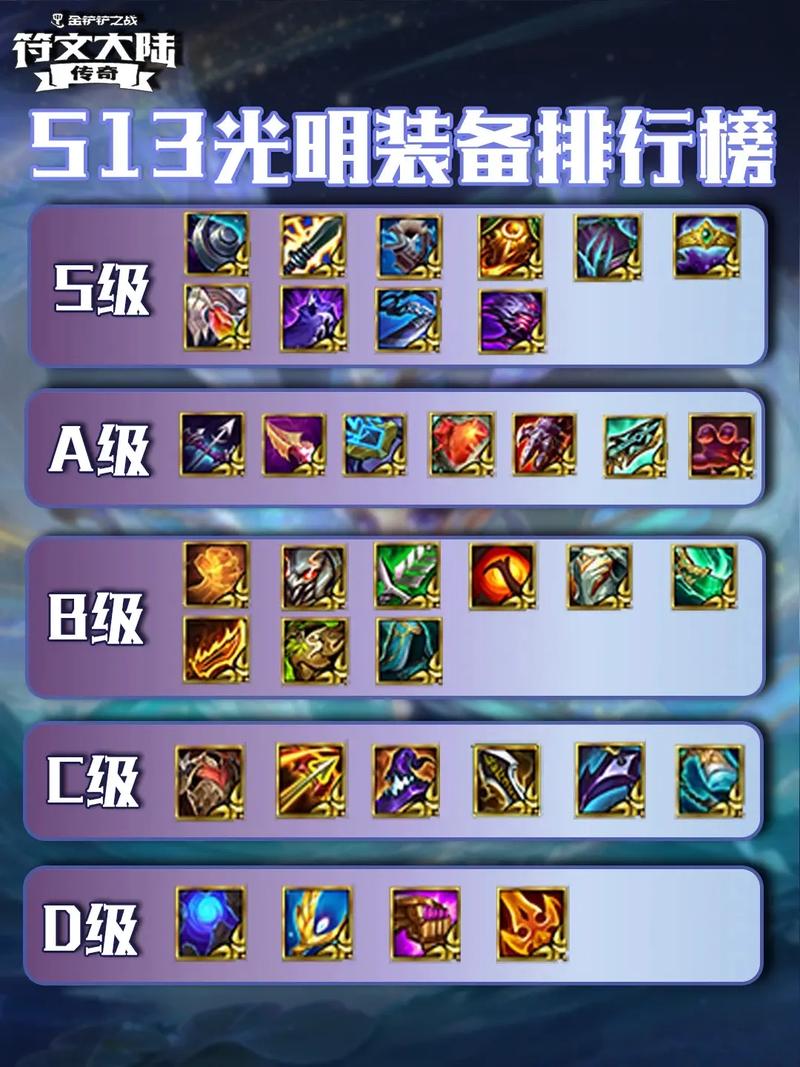 〖Three〗、在金铲铲之战S9赛季中,光明装备强度排名第一的是天顶锋刃,它能够使来自技能的伤害造成暴击,从而大幅提升输出能力。排名第二的是海克斯科技生命之刃,它能提供35%的全能吸血效果,同时还能治疗生命值最低的友军,其治疗效果相当于部分实际伤害值的恢复,进一步增强了团队的生存能力。