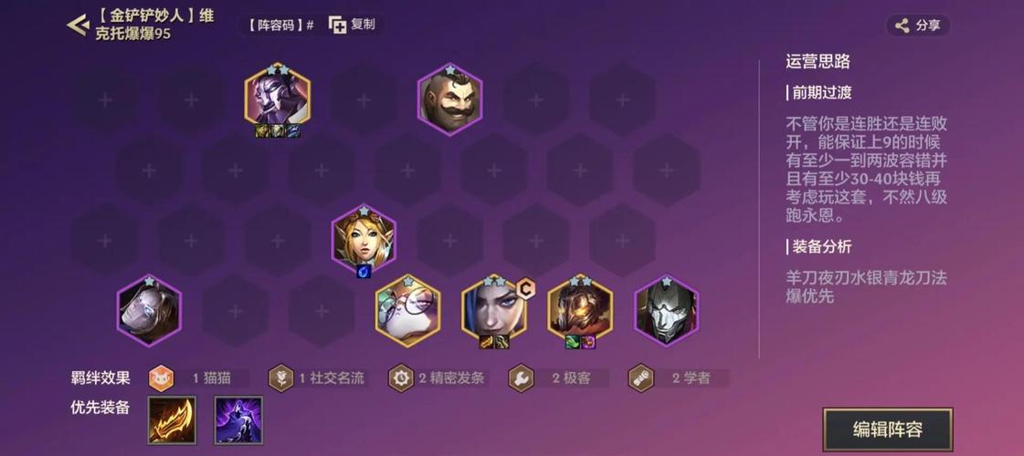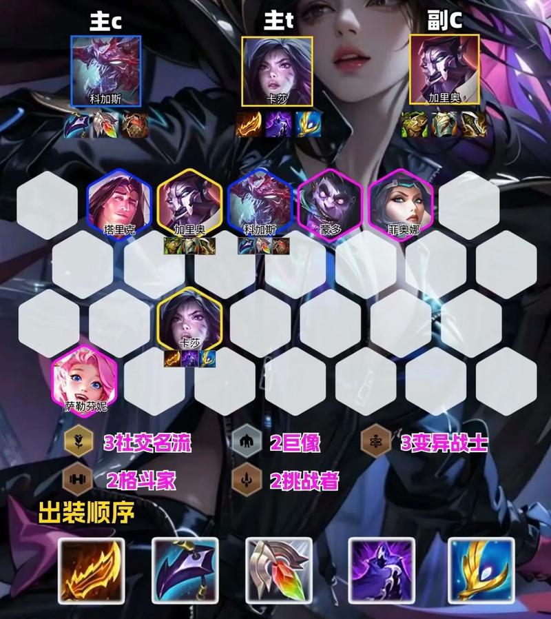 阵容构建 辛迪加刺客阵容由图奇、德莱厄斯、泰隆、卡特琳娜、婕拉、萨科、艾克、布隆和阿卡丽组成。其中,萨科作为核心输出,阿卡丽作为副输出,布隆作为主坦克。过渡策略 开局建议在2-1阶段拉4人口,2-5阶段拉5人口,初期以2刺客、2保镖、2战斗学院为过渡。