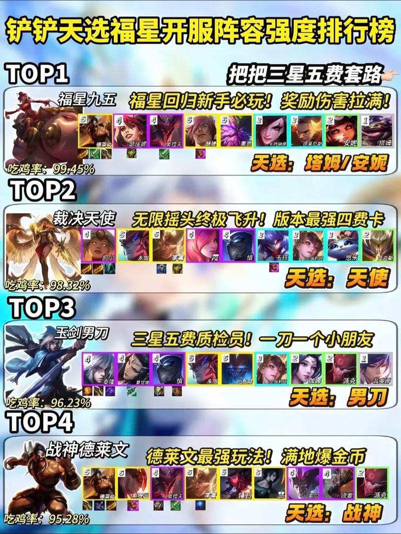 金铲铲之战天选福星玩法及最强阵容推荐如下:天选福星玩法:在游戏中,你会有几率刷到天选英雄,这些英雄直接为2星,属性高于普通2星英雄。天选英雄会带有一个特定的羁绊加成,如亚索的决斗大师羁绊上场后会视为+1。不同等级刷到天选英雄的概率不同,如1-3级时,刷到1费天选英雄的概率为100%。