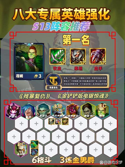 幻灵战队阵容由霞、塞拉斯、烬、俄洛伊、薇恩、悠米、蕾欧娜、雷克顿、阿萝拉组成,羁绊包括7幻灵战队、2人造人、2堡垒卫士、2强袭射手、2重装战士、1圣灵使者、1鳄霸。这些羁绊共同提升了阵容的强度和灵活性。强化符文与出装推荐 强化符文首选“幻灵转职”,只需两个转职就能大成,是十幻灵无解大羁绊玩法的关键。