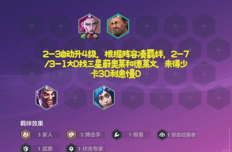 〖Three〗、阵容组成 核心羁绊:5伏击、3家人、2监察、2极客、2执法官、1外交官。具体棋子:爆爆、蔚奥莱、范德尔、卡密尔、史密奇、盖伦、艾克、金克丝、凯特琳。装备推荐 主C爆爆:装备推荐为正义之手×帽子。正义之手可以提供吸血和额外伤害,帽子则能大幅提升法强。