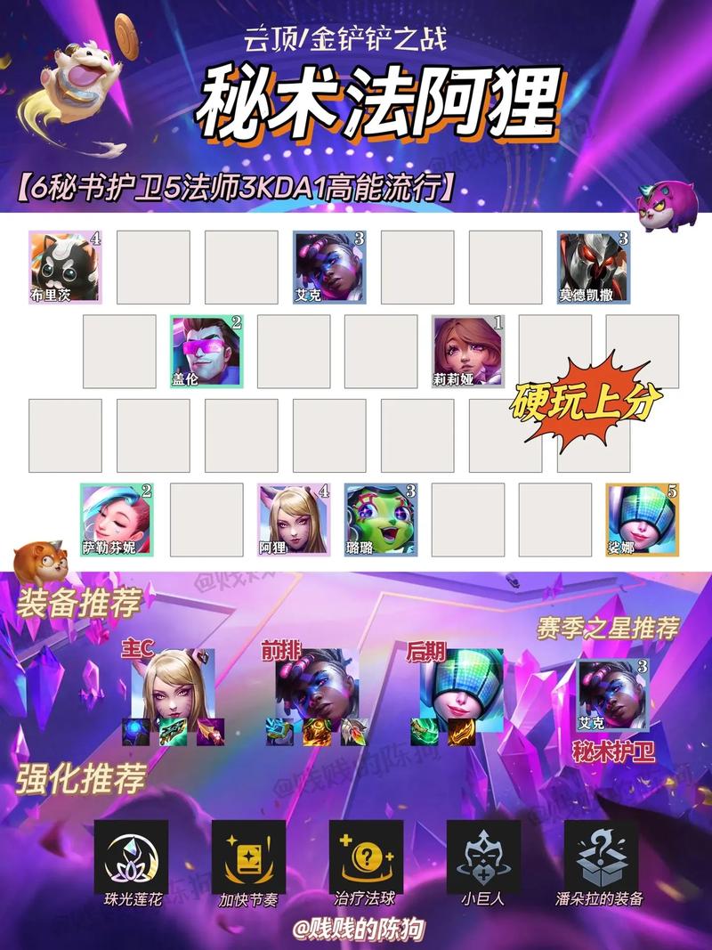 〖Two〗、金铲铲之战福星版本九五至尊阵容装备搭配如下:主C腕豪装备搭配 无尽之刃:提供高额的暴击伤害,配合腕豪的技能可以发出更高的百分比魔法伤害。珠光护手(法爆):增加技能暴击概率和技能暴击伤害,进一步提升腕豪的输出能力。科技枪:提供吸血效果,增加腕豪的续航能力,在战斗中能够持续输出。