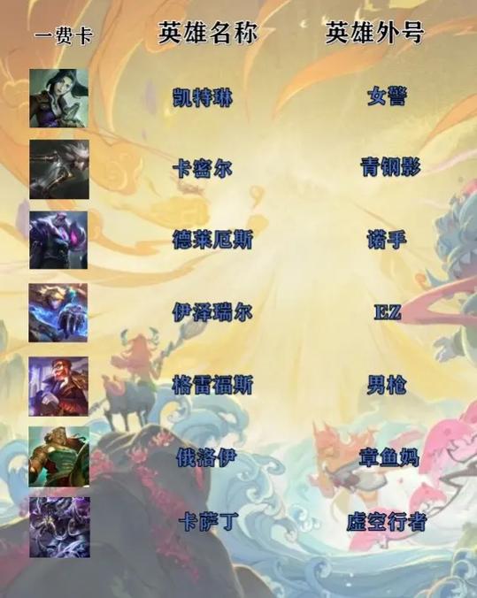 费卡:2费卡:3费卡:4费卡:5费卡:以上登场英雄收集自PBE端游S6赛季,金铲铲之战基本与端游同步,具体还是以官方通告为准。
