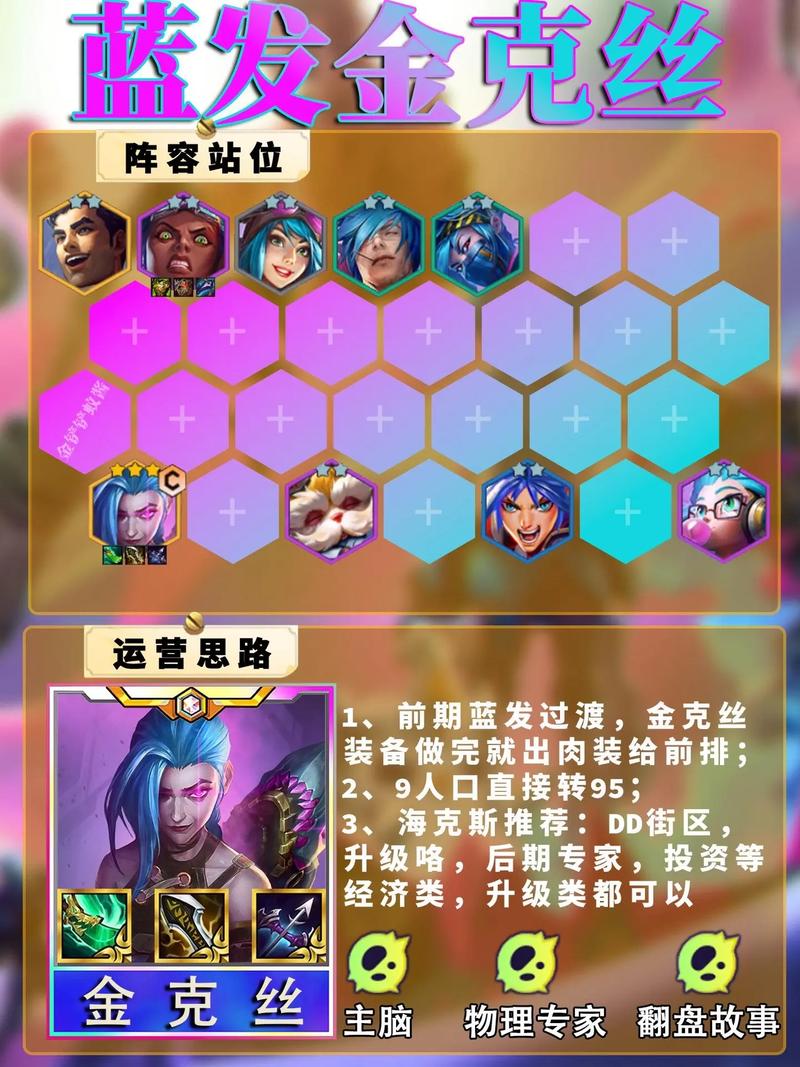 英雄组成方面:EJ、球女、时光老人、艾克、烬、萨勒芬妮、泽丽、杰斯,各英雄站位如图: 装备方面:艾克的装备配置为传送门、冰心、锁子甲。传送门能够吸引伤害,为AD角色争取输出时间;冰心则能群体降低敌方大部分棋子的攻击速度。