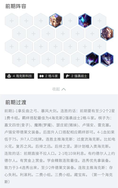 〖Two〗、开局建议抢攻速或拳套,2阶段可选取连胜或连败过渡。连胜需执事海克斯或VIP男刀和装备支持,连败则利用约德尔人或赏金连败策略。3-2阶段拉6人口,大D找全阵容二星。拥有执事转职时上5执事,否则3执事搭配保镖过渡。存够50块钱卡利息,精简操作,寻找三星男刀。