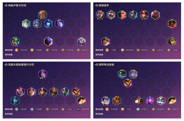 〖Four〗、阵容分析与组合 组建4狂刃战士、4幻镜龙、2屠龙勇士、2幽影龙、2迅捷射手、2格斗、2护卫和1冒险家的羁绊,形成强大的阵容。强化符文推荐 优先选取战力类符文,如万用瞄准镜Ⅱ、直击弱点、提亚马特、伺机待发。功能类符文推荐迅捷射手纹章、便携锻炉、DD街区、纷乱头脑。