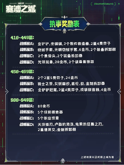 〖Four〗、金铲铲执事层数奖励表如下:基础层数奖励 1层:获得基础执事徽章,解锁执事专属头像框。5层:额外获得执事专属表情包一套,增加游戏内互动乐趣。10层:解锁执事专属回城特效,提升游戏内视觉体验。进阶层数奖励 15层:获得执事专属击败特效,彰显执事尊贵身份。