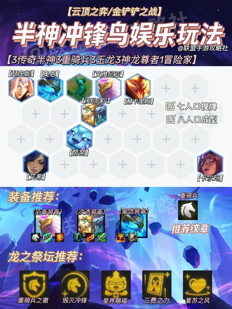 云顶之弈S7重骑冰鸟玩法如下:阵容搭配:以冰鸟为主C,狗熊为副C。成员包括努努、猪妹、人马、奥恩、亚索、艾希、奶妈,共九人。羁绊组成:3传奇半神、1唤星者、4重骑兵、3玉龙、3神龙尊者、2幻镜龙、1冒险家。强化符文:优先:重骑兵转职类、阿福的百宝袋、星界赐福。