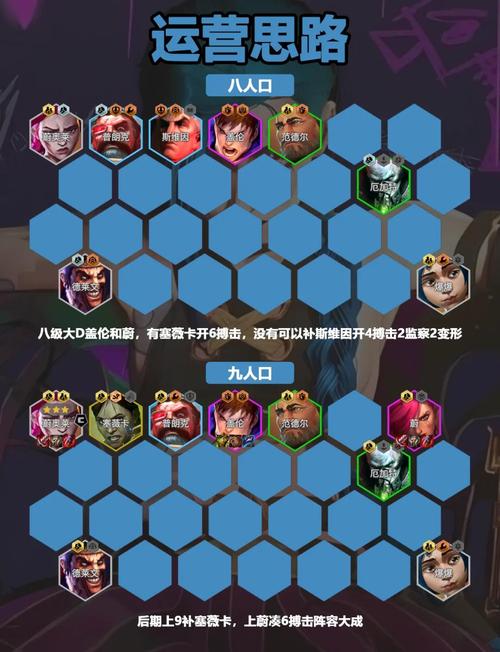阵容组成 核心英雄:蔚奥莱、德莱文、赛薇卡、范德尔、蔚、普朗克、厄加特、诺手、爆爆。羁绊组成 关键羁绊:1百变铁手、6搏击手、4家人、2铁血征服者、2极客、2监察。