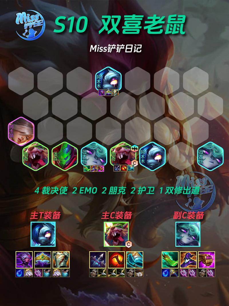〖Three〗、金铲铲之战s10朋克老鼠阵容怎么搭阵容组成 老鼠(图奇)、爆爆(金克丝)、蔚、潘森、薇古丝、莎弥拉、锤石、螃蟹(厄加特)装备推荐 老鼠:羊刀、杀人剑(死亡之刃)、红buff 潘森:板甲、狂徒、龙牙 运营思路 前期走连败吃经济,并且可以选秀先拿装备,保证装备上限。