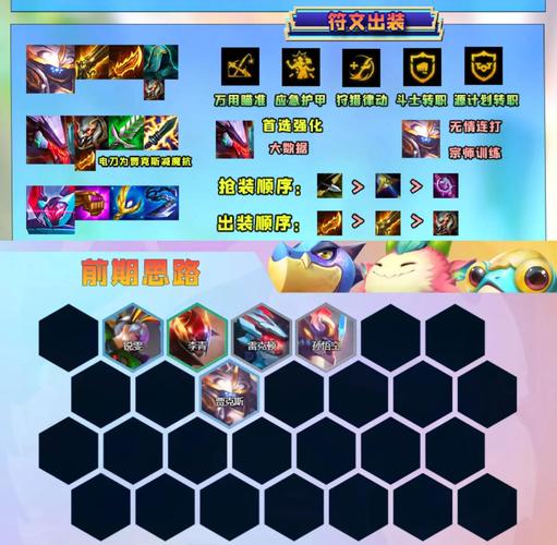 〖Two〗、金铲铲之战中,阵容搭配至关重要。首先,我们需要考虑棋子构成。例如,可以选取北地之盾、狂暴之心、冰川骑士、霜卫首领、焰魂、迅箭和臻冰之箭。在8人口时,根据对局情况,可以选取将焰魂换成灵鸟毕方,组成6北地,增强控制能力;或者选取不屈之枪或曙光神将来组成2护卫羁绊,提升大部分棋子的护甲。