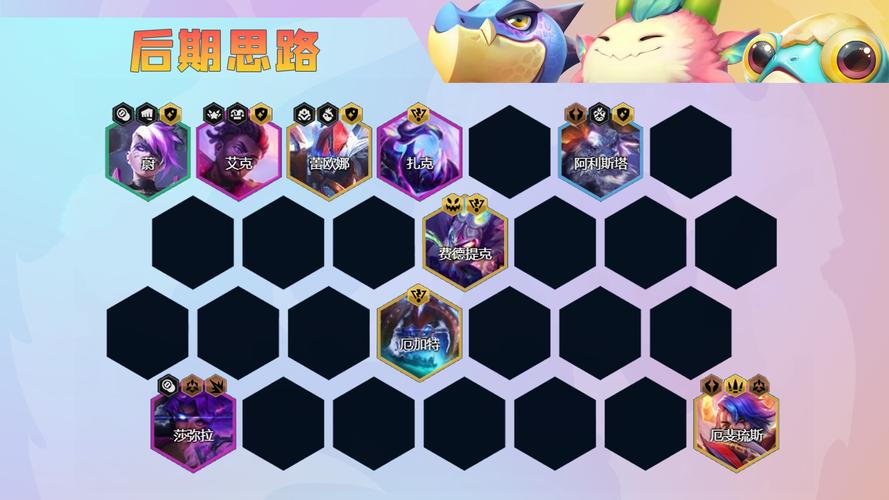〖One〗、阵容组成:阿利斯塔、蔚、艾克、沙弥拉、厄加特、厄斐琉斯、努努、费德提克阵容羁绊:3秘术、2怪兽、2枪手注意:蔚+猪妺后期可以换蕾欧娜+索尔,如果蕾欧娜来得早可以厄加特换蕾欧娜开4秘术。