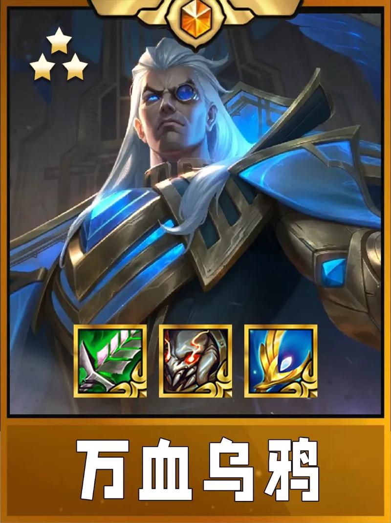 羁绊棋子,技能造成群体伤害与群体吸血,在变身结束后还能额外造成一次群伤,技能效果逆天特别是搭配4帝国羁绊的时候,伤害极高,而在6换型羁绊下能增加极高生命值,变身打不死的小强。总而言之,金铲铲之战乌鸦的最佳装备是鬼书、复活甲、反甲,这是最适合乌鸦的装备了,别的装备则次之。