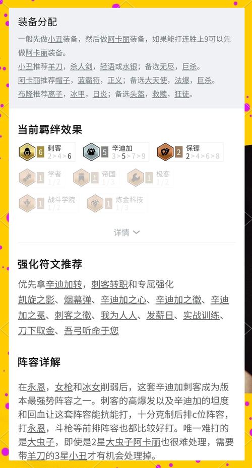 〖Five〗、金铲铲之战中,推荐采用辛迪加刺客5辛迪加4刺客2保镖的阵容。具体来说,这个阵容包括小丑、阿卡丽、艾克等核心棋子,以及辛迪加和刺客羁绊。小丑作为主C,优先选取无尽之刃和羊刀。无尽之刃用来提高伤害,而羊刀可以提高攻速,非常适合小丑这种依赖攻速的棋子。