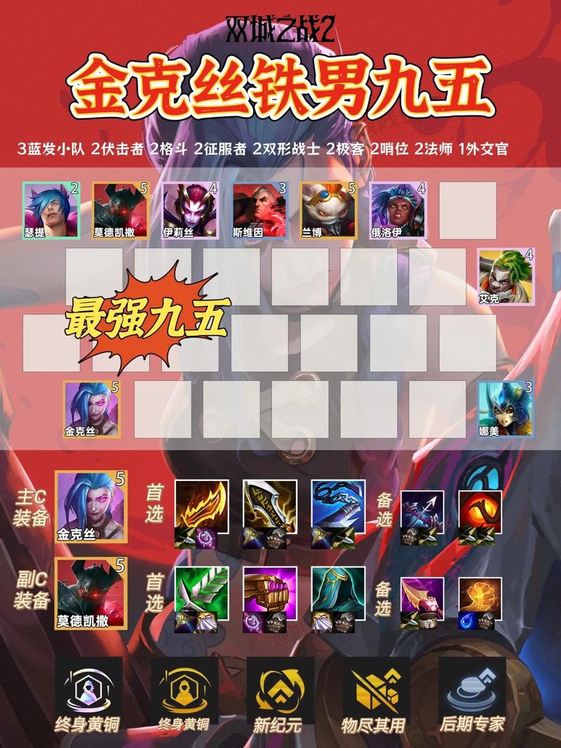 〖Four〗、过渡不要死板,只需强势连胜即可。学到现在大家是否发现,能玩的五费卡牌特别多。几乎到了9人口,什么两星都是对的。再加上名流卡莎、名流金克斯,九五的组合多不胜数。比较强势的就是极客九卓尔不群,逻辑是金克斯维克托C、烈娜塔五费C,杰斯卡莎C,卡莎维克托C,泽丽卡莎C等等。