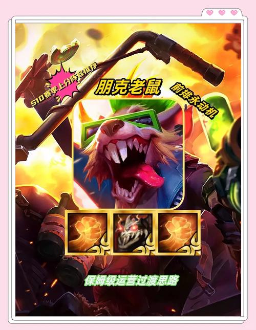 金铲铲之战S10双喜临门老鼠玩法介绍如下:阵容组成 核心英雄:阿木木、潘森、老鼠、薇古丝、阿卡丽/死歌/莎弥拉。羁绊组成 主要羁绊:4裁决使、2朋克、2护卫、2EMO。装备推荐 老鼠:推荐装备为红buff、无尽、正义,这些装备能大幅提升老鼠的输出能力。