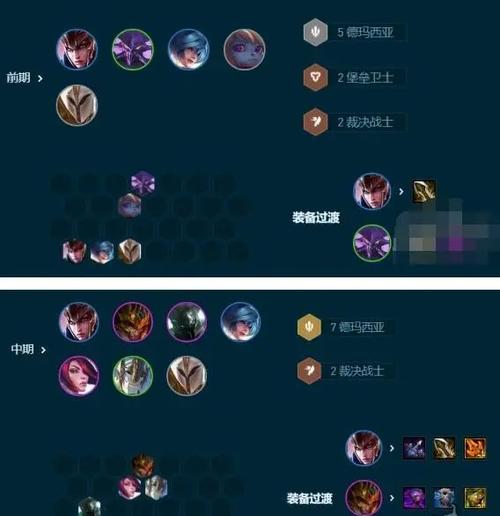 〖One〗、金铲铲之战S5转职7德玛,卡莎带你上分的阵容及策略如下:阵容组成 核心成员:加里奥、波比、皇子、剑姬、琴女、奎因、天使、7德玛西亚(若有转职可替换天使为其他高费卡)。转职建议:若拥有德玛西亚转职,可给予卡莎,替换掉天使,并补充铁男或其他高费卡以提升阵容上限。