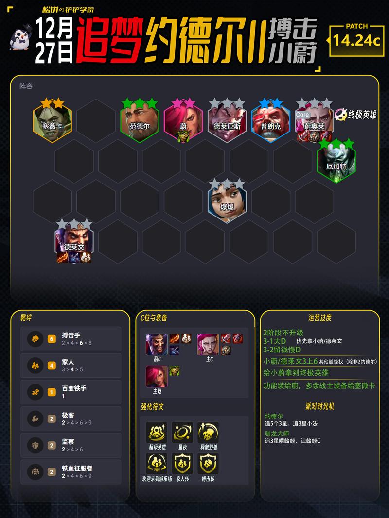 〖Four〗、核心羁绊:5德玛西亚。德玛西亚羁绊能提供额外的生命值和护甲加成,以及技能伤害减免,非常适合天使这样的物理输出英雄。其他羁绊:可根据实际情况选取裁决使、法师等羁绊来增强团队的整体实力。在9级时,若有德玛西亚转职,可考虑开7德玛或4裁决羁绊。实战建议:前期走连胜,选秀优先做天使的三神装。