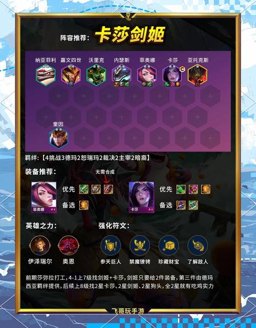 阵容站位 让纳亚菲利或剑魔站在剑姬旁边给剑姬提供额外效果,奎因与剑姬同侧速度过掉前排。装备分析 剑姬带双吸血,第三件光明装备是固定的光明血手。奎因拿物理装备,第三件固定光明杀人剑。多余防装给皇子。强化分析 开彪必备,打气除了银色都可以拿。