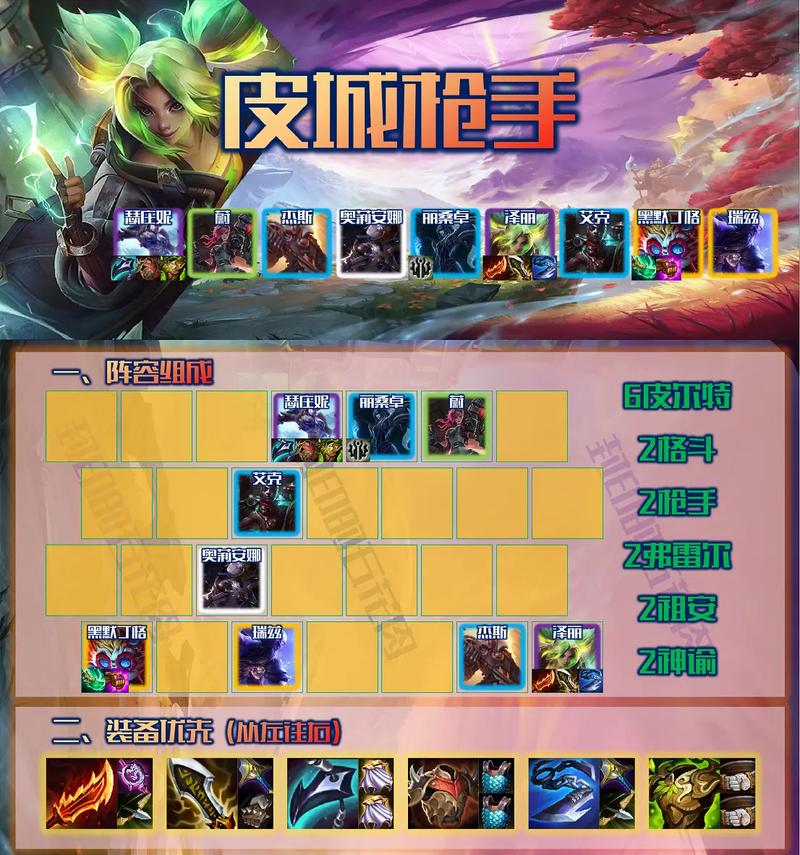 〖One〗、阵容核心 皮城枪阵容主要以皮尔特沃夫羁绊为核心,通过搭配其他强力英雄和装备,形成高爆发、高输出的阵容。装备搭配 主C泽丽:装备选取羊刀、无尽和轻语/红buff/巨杀。羊刀和无尽可以提升泽丽的攻击速度和暴击伤害,轻语则能穿透敌方护甲,红buff提供灼烧效果,巨杀则对高血量敌人造成额外伤害。