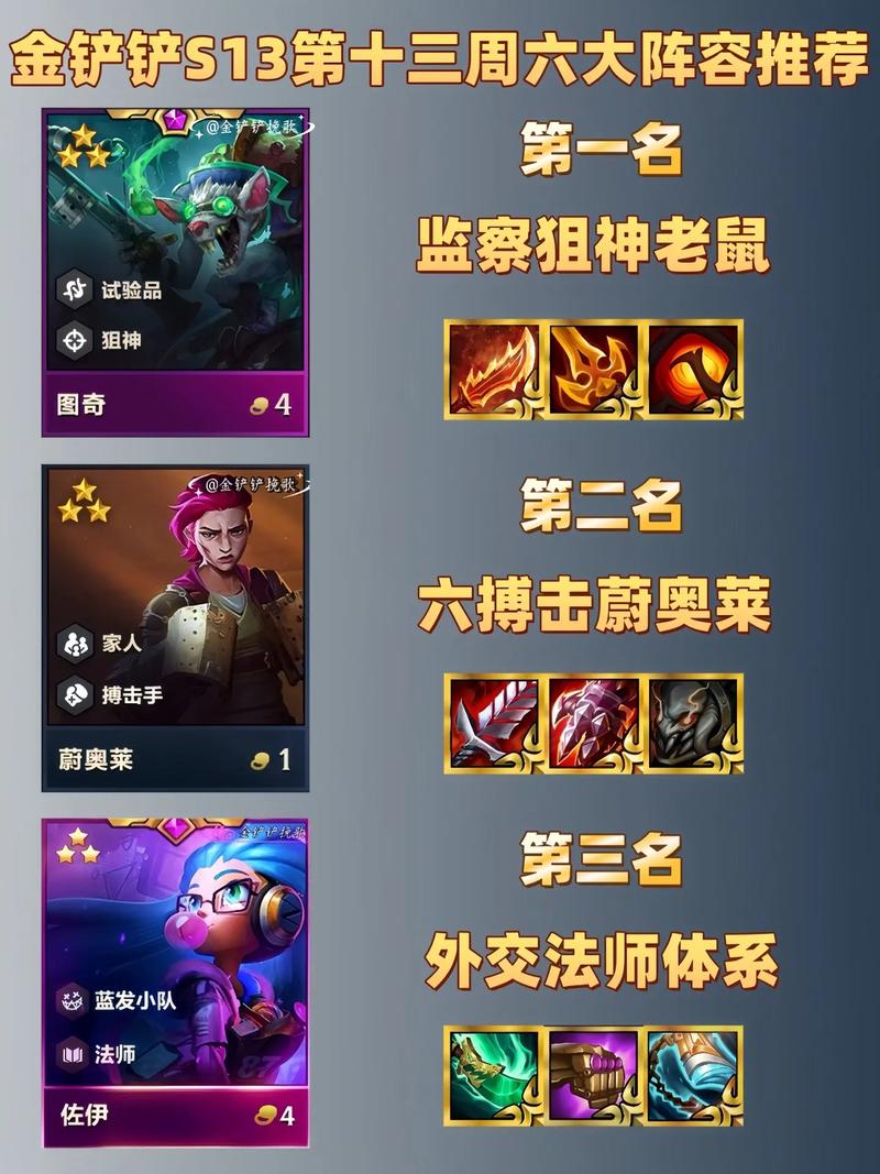 〖Three〗、金铲铲之战6狙5执法阵容玩法推荐阵容组成、装备及海克斯介绍9人口阵容:女警、艾希、猪妹、女枪、烬、蔚、杰斯、泽丽、发条装备方面:水滴/棒子/腰带开,主找前排装和女枪三神装电刀、帽子、巨杀;女枪装备没有也没关系,速八找泽丽随便带点装备就很强。