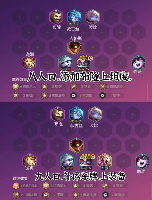 薇古丝:作为阵容的主要坦克,需要石像鬼板甲(锁子甲+负极斗篷)、反甲(锁子甲+锁子甲)和龙牙(负极斗篷+负极斗篷)来增强防御能力。维克托:作为次要输出,装备可以给到羊刀(反曲弓+无用大棒)、青龙刀(暴风大剑+女神之泪)和法爆,以提高他的输出能力和技能释放频率。