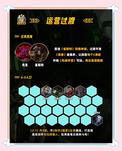 阵容核心 皮城枪阵容主要以皮尔特沃夫羁绊为核心,通过搭配其他强力英雄和装备,形成高爆发、高输出的阵容。装备搭配 主C泽丽:装备选取羊刀、无尽和轻语/红buff/巨杀。羊刀和无尽可以提升泽丽的攻击速度和暴击伤害,轻语则能穿透敌方护甲,红buff提供灼烧效果,巨杀则对高血量敌人造成额外伤害。