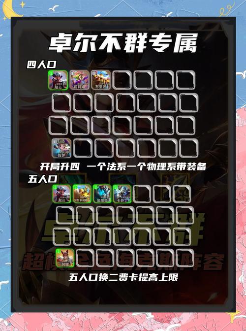 核心阵容为3名流、2极客、2保镖,包括布里茨、加里奥、纳尔、泽丽、金克丝、希尔科、萨勒芬妮与卡莎。卓尔不群的玩法强调不拘泥于传统羁绊,故无须过渡,选取与阵容互不相干的英雄为佳。转职方面,最佳选取为名流纹章或名流之心,以实现5名流的配置,去掉爆爆或泽丽,以此最大化阵容的战斗力。