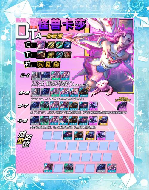 蓝霸符:缩短卡莎技能的冷却时间,确保她能够频繁释放大招,是核心装备。无尽之刃:增加暴击伤害,提升卡莎的输出能力。第三件装备:根据实际情况选取,如鬼索刀(增加攻击速度)或水银(提供免疫控制效果)。阵容搭配 前期过渡:使用低费星守成员如拉克丝、佐伊等过渡,同时存钱等待中期关键棋子的到来。