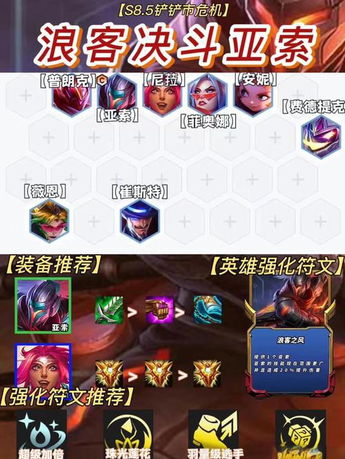 〖Two〗、《金铲铲之战》浪客之风亚索玩法攻略 符文分析 最佳符文:公理圆弧,此符文能显著提升亚索的技能释放频率。备选符文:星界赐福、狩猎律动或科技枪,这些符文可以增强亚索的生存能力和续航能力。若选用科技枪,可考虑替换为正义之拳以平衡输出与防御。