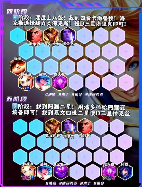 核心羁绊:5裁决战士、3艾欧尼亚、3诺克萨斯。关键英雄:劫(主C)、卡特琳娜、艾瑞莉娅等。传说之力与符文分析 传说之力:根据开局情况灵活选取,但崔斯特和德莱文的专属符文对阵容有较大提升。符文推荐:裁决转职优先给卡特琳娜,其余可选血蛭、理想主义、舔血刀口、投资回报等增强续航和输出能力的符文。