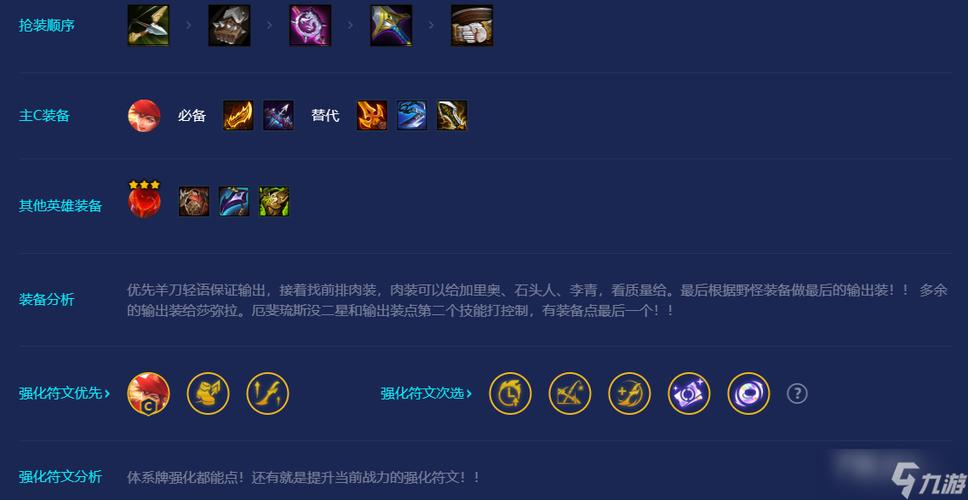 卡莎装备:正义之手和夜之锋刃是核心装备,提供攻击加成、吸血和稳定的攻速。备选装备为鬼索的狂暴之刃,进一步提升输出能力。前排装备:卡萨丁需要装备传送门,确保队友死亡后能为变异单位带来属性加成。肉装可以给蔚,输出装则可以给螳螂。运营策略:开局抢装:优先抢反曲之弓,以便制作传送门等核心装备。