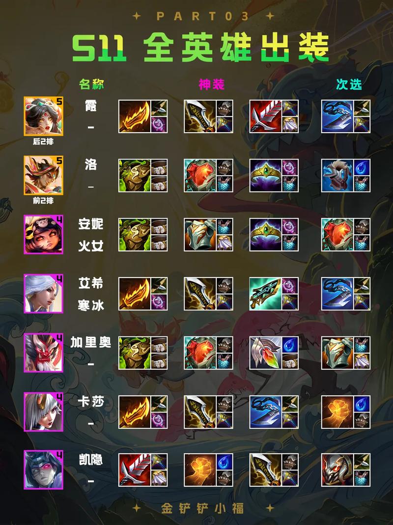 羁绊效果:获得独特装备,生命值和攻击速度随羁绊数量和装备数量提升。羁绊英雄:贾克斯、烬、纳尔、莫德凯撒、韦鲁斯、瑟庄妮、泽丽上面就是金铲铲之战S14赛季的所有羁绊及其对应英雄。