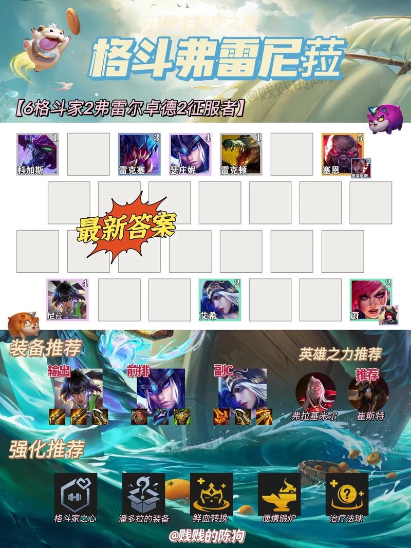 装备分析 核心装备:火炮是尼菈的首选装备,能够提供攻速和攻击距离加成,极大提升尼菈的输出能力。由于火炮的重要性,建议优先合成两件火炮给尼菈。前排肉装:板甲和反甲是前排坦克的关键装备,能够提升坦克的生存能力和抗性。巨杀则用于针对高血量敌人,龙牙则提供魔法抗性。