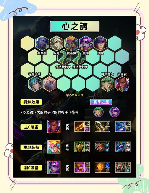 应对不同挑战。总结 “心之钢卡特”阵容凭借其独特的机制和强大的战斗力,成为《金铲铲之战》中的致胜首选。通过合理的英雄搭配和装备选取,以及灵活的战术布局,每位玩家都能在这场激烈的对决中找到属于自己的胜利之路。不断优化阵容组合和装备搭配,将帮助你在游戏中取得更多胜利。