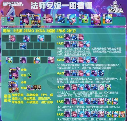 前期:用璐璐带装备过渡,2-1回合没有出英雄强化,就上泰隆拼羁绊,提高3-2回合刷安妮反射护盾英雄强化的概率。中期:小天才装备优先补佐伊、安妮、努努的装备,尽量放满三件。小天才转职中期给乐芙兰或索尔。后期:先上两星的5费英雄,没两星5费就给1星费德提克。