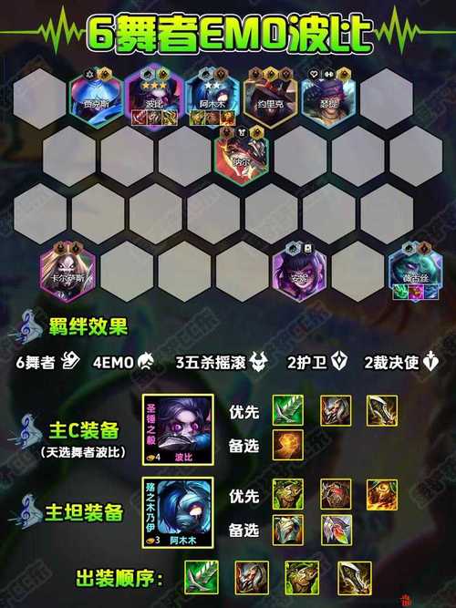〖One〗、羁绊:6碧波3法师2格斗2魔导2幽影1龙神。 核心装备: 索姆:作为阵容的主C,索姆的装备选取以法师输出装为主,如蓝霸符、无尽法爆、大帽或巨杀等,这些装备都能大幅提升索姆的技能伤害。 尼菈:尼菈作为副C,装备选取无尽、正义/饮血、穿甲/夜之锋刃等,这些装备能够提供足够的输出能力和生存能力。