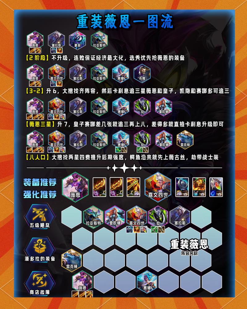 〖Three〗、瑟庄妮:必备狂徒铠甲(增加大量生命值)、圣盾使的誓约(提供护盾和生命回复)。泽丽:必备鬼索的狂暴之刃(提供攻击速度叠加效果),可额外配备一件相同装备以增强输出。运营思路 前期尽量以三执事羁绊为主,如果执事英雄不胡,可以考虑利用其他强势英雄进行连胜,后续再转型为执事德莱文阵容。