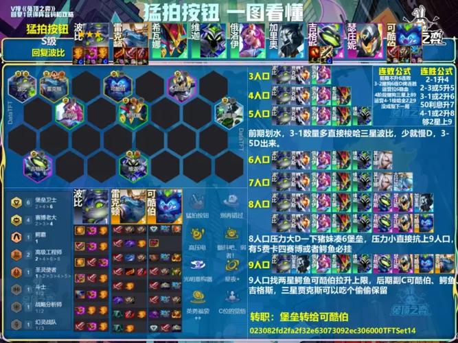 〖Two〗、开局策略:刚需开局使用“猛拍按钮”符文,2阶段不升级,专注于凑齐六堡垒和小法。中期运营:在3-1阶段搜点到30金币停手,以便在3-2阶段自然升级到5级。追3星:在3-2阶段卡40~50金币,利用利息追3星波比、维迦、俄洛伊或希瓦娜。波比到3星后可以先升级,最迟在4阶段将波比追到3星。