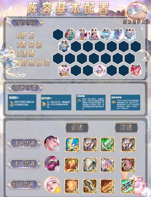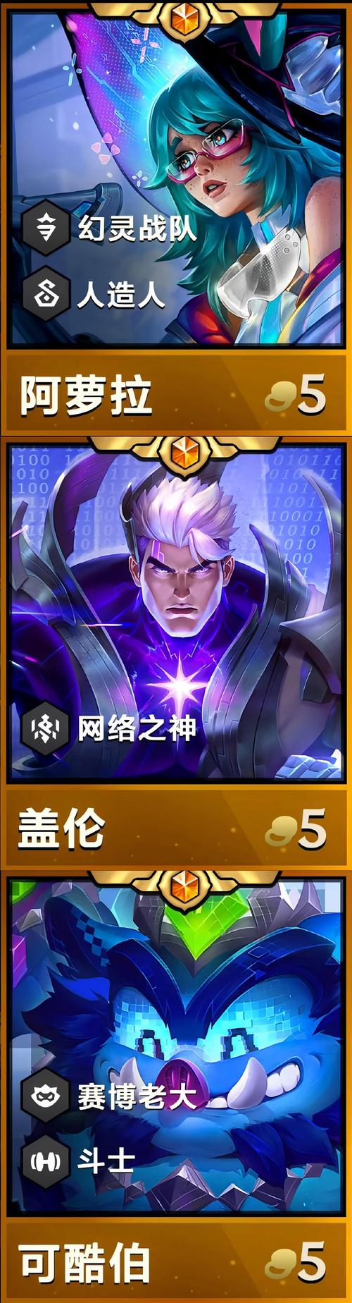 八重装盖伦:以盖伦为核心的重装战士阵容,具备强大的前排坦度和输出能力。摄魂狗头:利用狗头的高额输出和摄魂羁绊的回复能力,形成持续作战的阵容。宗师95:以宗师羁绊为核心的后期阵容,拥有强大的控制和输出能力。裁决天使:天神天选下霞开6天神羁绊,形成高爆发和高机动性的阵容。