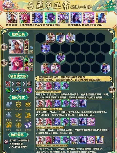 核心英雄:烬、伊莉丝、希瓦娜、厄运小姐、阿萝拉、瑟庄妮、奈德丽、千珏。这些英雄组成的阵容在S14赛季中展现出强大的战斗力,尤其适合赌狗玩法。强化推荐 优选强化:透体莲花I(提升技能穿透)、星夜(增加法术强度与攻击力)、备用零件(提升装备适配性)。