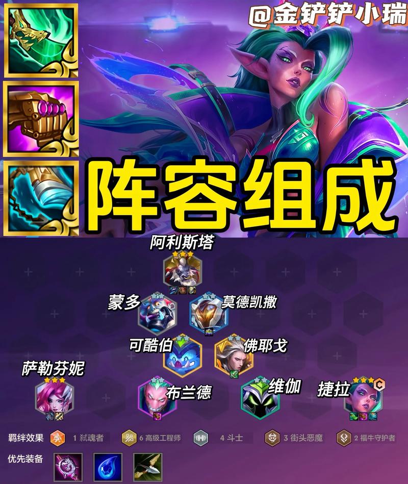 推荐选取+1/2黑魔法师、黑魔法师转职、白魔法师转职、+1/2白魔法师和符能护盾等,以增强阵容的羁绊效果和整体战斗力。运营攻略 前期以锁子甲或腰带开局,优先做出薇古丝的肉装,利用3约德尔羁绊白嫖3星薇古丝。2-1拉4人口,2-5自动拉5人口,提前拉5人口以白嫖3费卡的薇古丝和马尔扎哈。