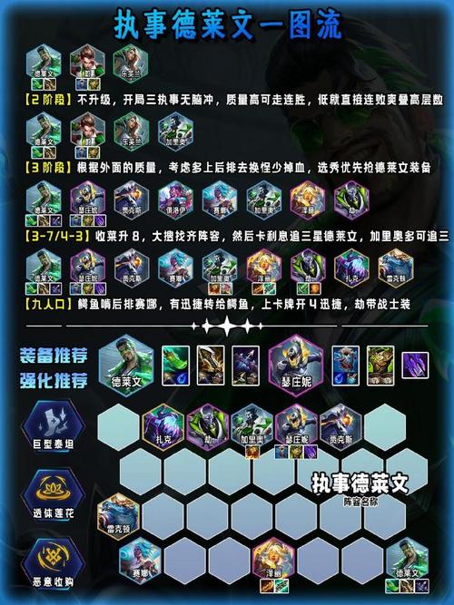 莎弥拉:必备无尽之刃和最后的轻语,以提高暴击伤害和穿甲能力。吉格斯:必备珠光护手和斯塔缇克电刃,以增强技能伤害和群体输出。佛耶戈:必备窃贼手套,以获得多样化的装备效果。运营思路 前期:优先拿经济类强化,确保阵容能够快速成型。同时,如果质量较高,可以考虑拿装备类强化打连胜。