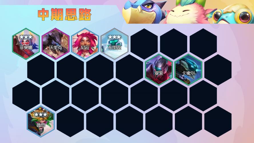 站位一:千珏保护后排,确保输出英雄能够安稳输出。猴子则用来拉刺客走位,分散敌方火力。站位二:抱团站位,主要针对刺客阵容,防止刺客切到后排C位。所有英雄紧密集合,形成坚不可摧的防御阵型。运营节奏 前期:开局选取三神将加上肉装和双骑士进行过渡。此时主要任务是存钱,不需要急于提升战斗力。