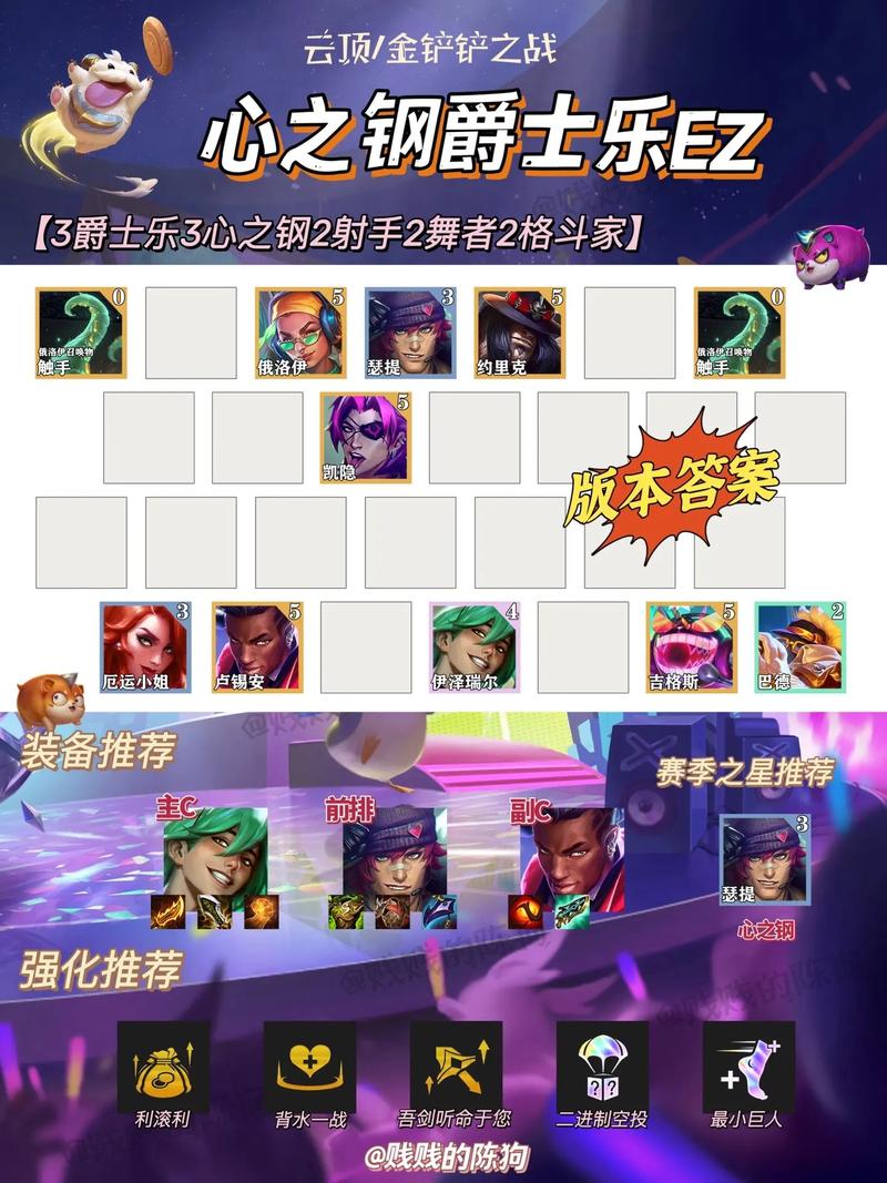 〖Five〗、金铲铲S10心之钢EZ搭配及后期锁血阵容推荐 心之钢EZ搭配 核心英雄:伊泽瑞尔(EZ)作为主要输出点,搭配心之钢装备可以获得额外的生命值和攻击力加成。装备推荐:对于EZ,推荐装备为无尽之刃、最后的轻语和正义之手。这些装备能够大幅提升EZ的物理输出能力,使其在游戏中发挥更大的作用。